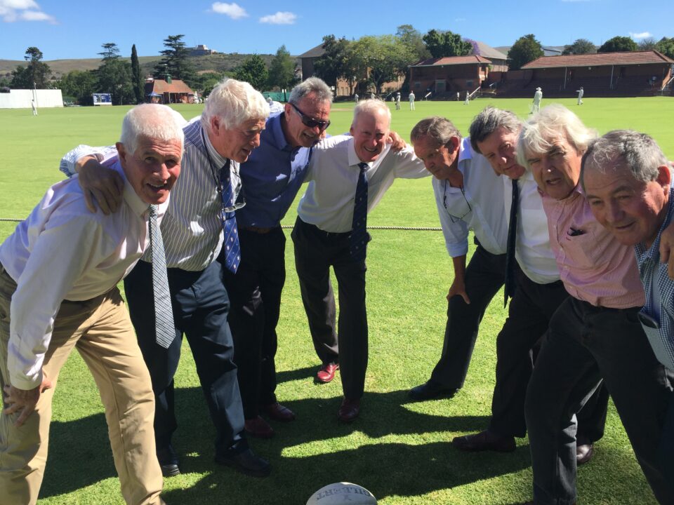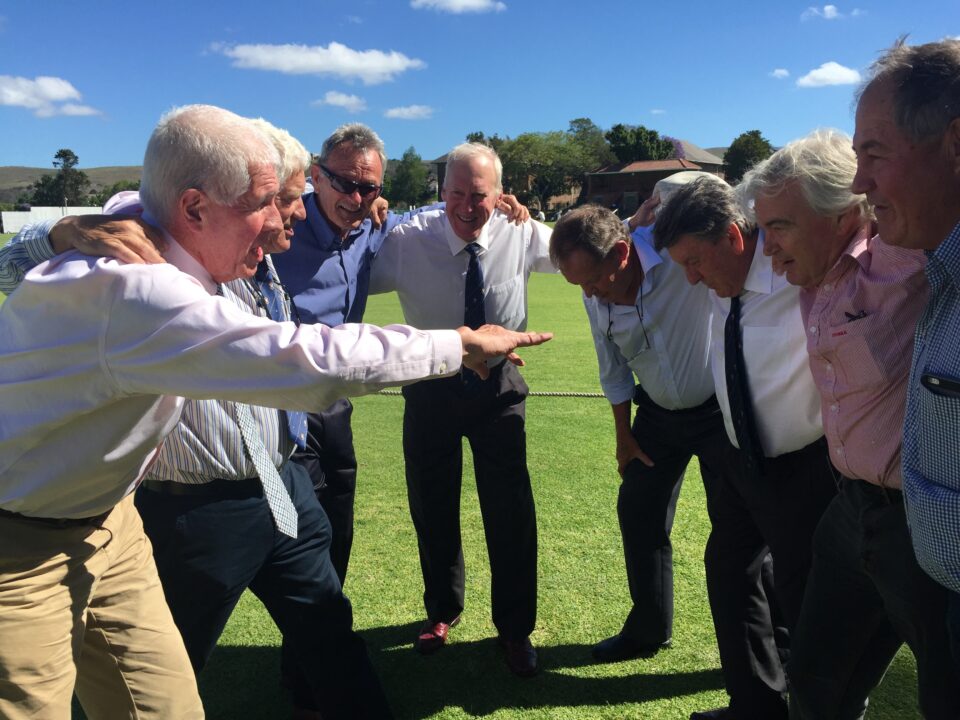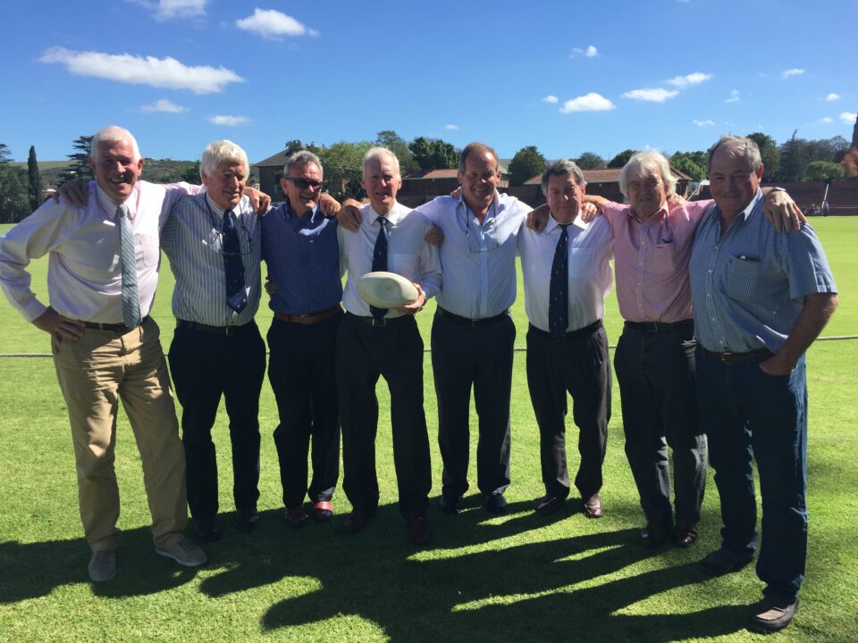 Members of the 1966 1st XV gathering on Lower Field during their 50th Reunion in 2016. Peter on the far left.